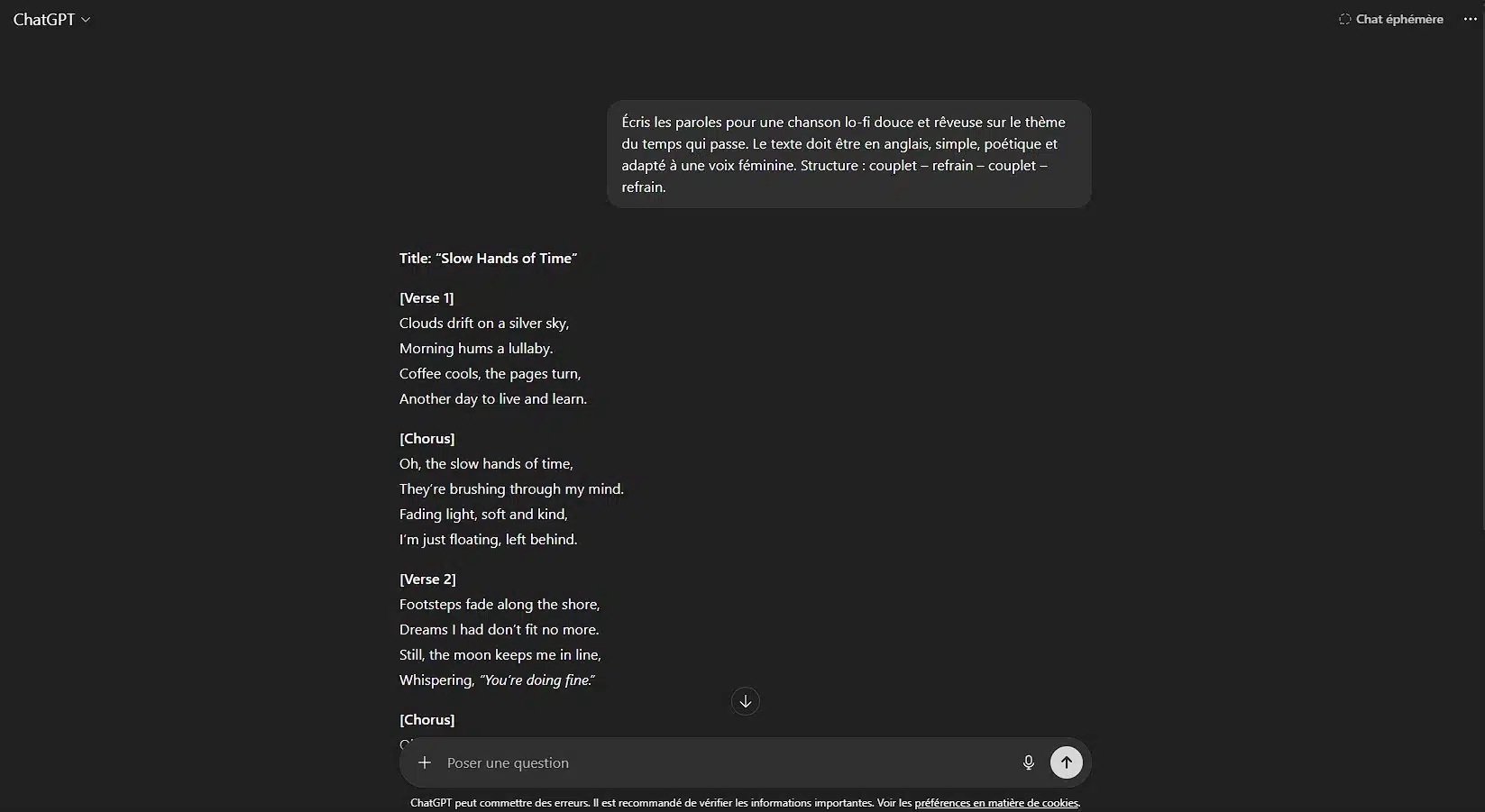 « Écris les paroles pour une chanson lo-fi douce et rêveuse sur le thème du temps qui passe. Le texte doit être en anglais, simple, poétique et adapté à une voix féminine. Structure : couplet – refrain – couplet – refrain. »
